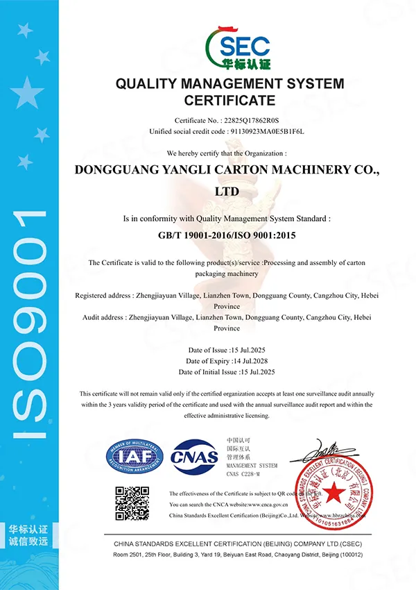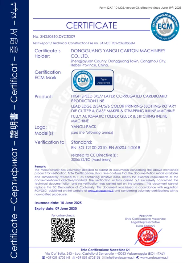 Fundada en 2002, Yangli Pack es un fabricante especializado en maquinaria y equipos para la producción de cartón corrugado. Nuestra sede se encuentra en el condado de Dongguang, en la ciudad de Cangzhou, provincia de Hebei, reconocido como el principal centro industrial de maquinaria para embalaje de cartón en China. Gracias a este entorno productivo y a una cadena de suministro altamente consolidada, podemos ofrecer soluciones competitivas y un servicio más eficiente. Además, nuestra cercanía a los principales puertos nos permite gestionar envíos internacionales más rápidos y con costos logísticos optimizados.